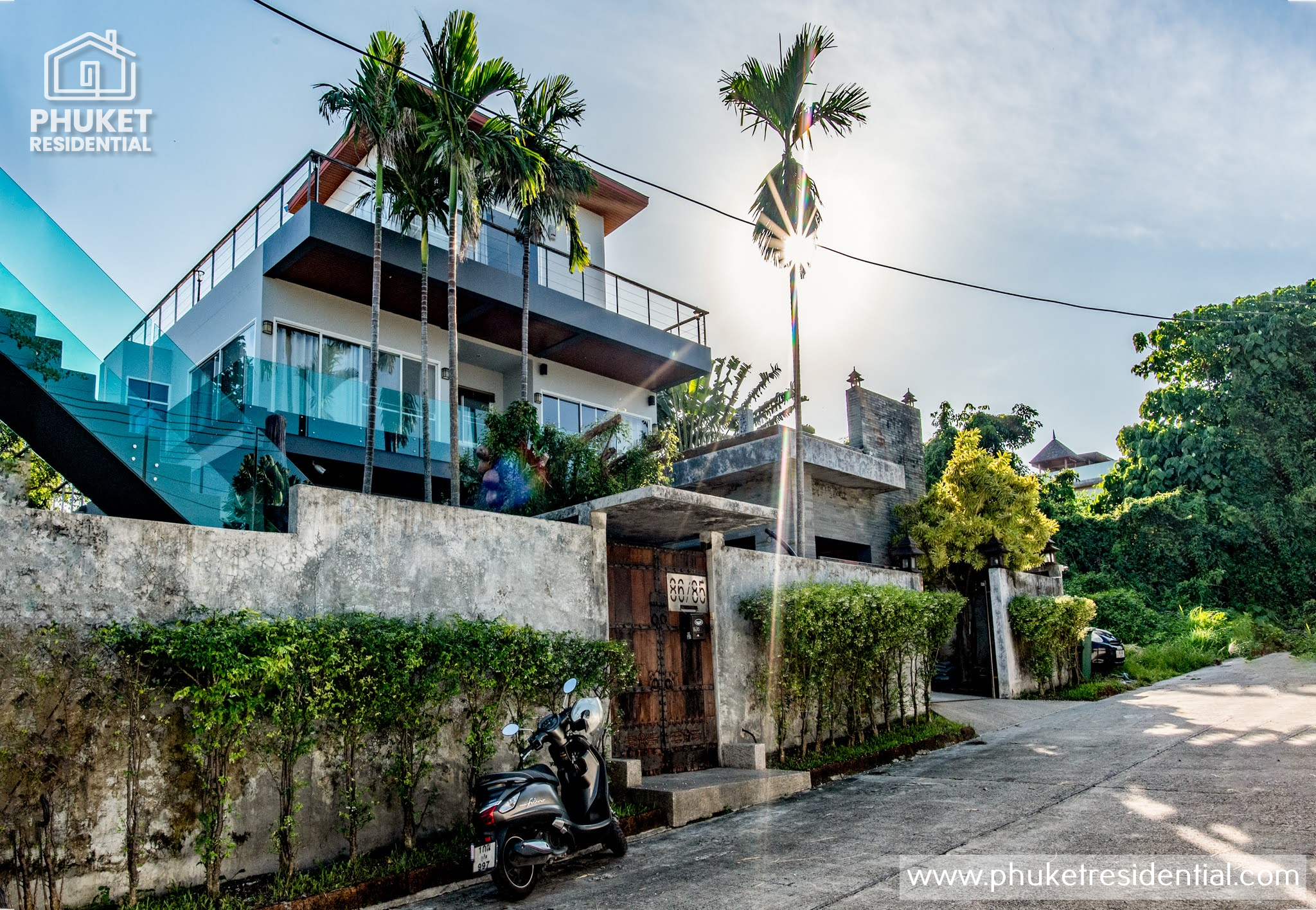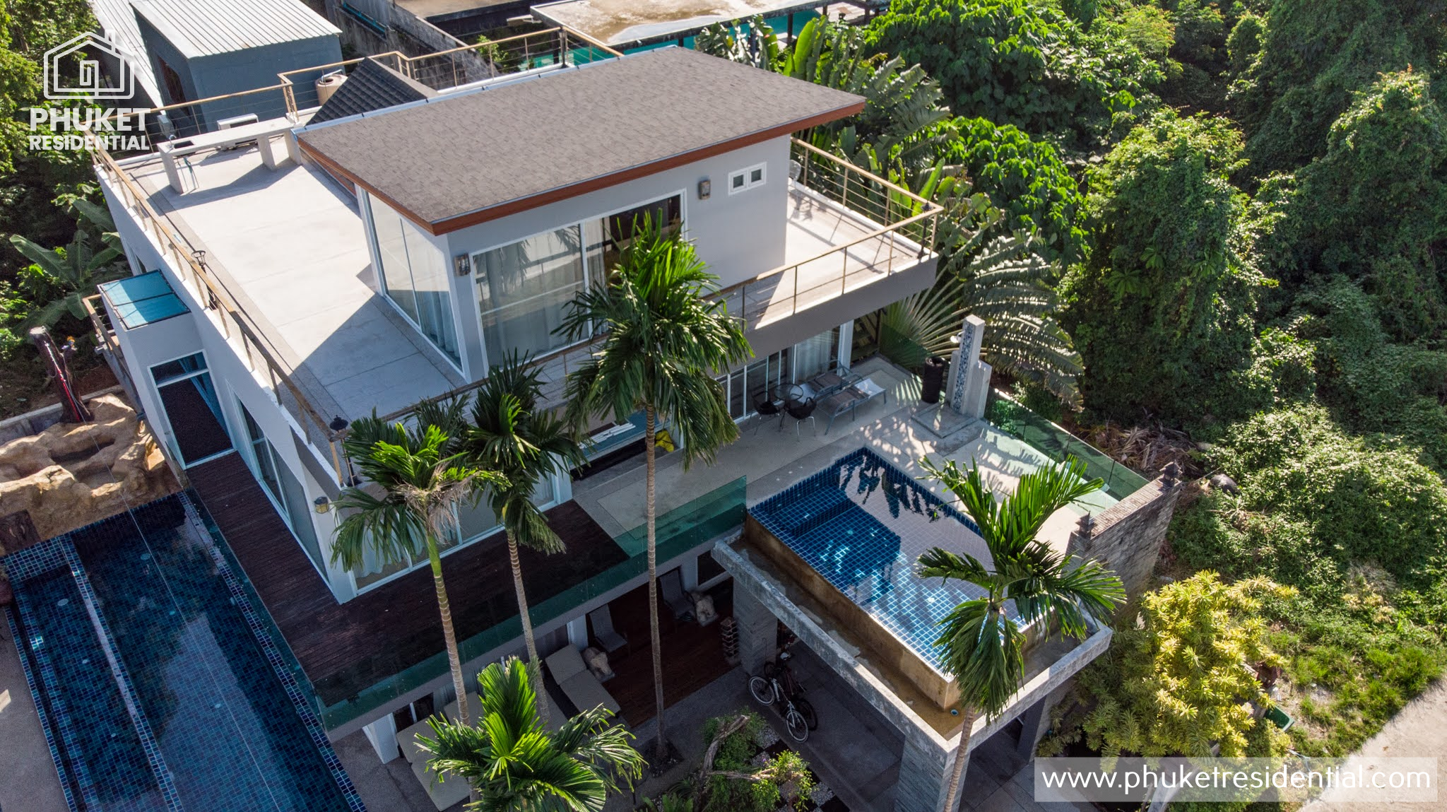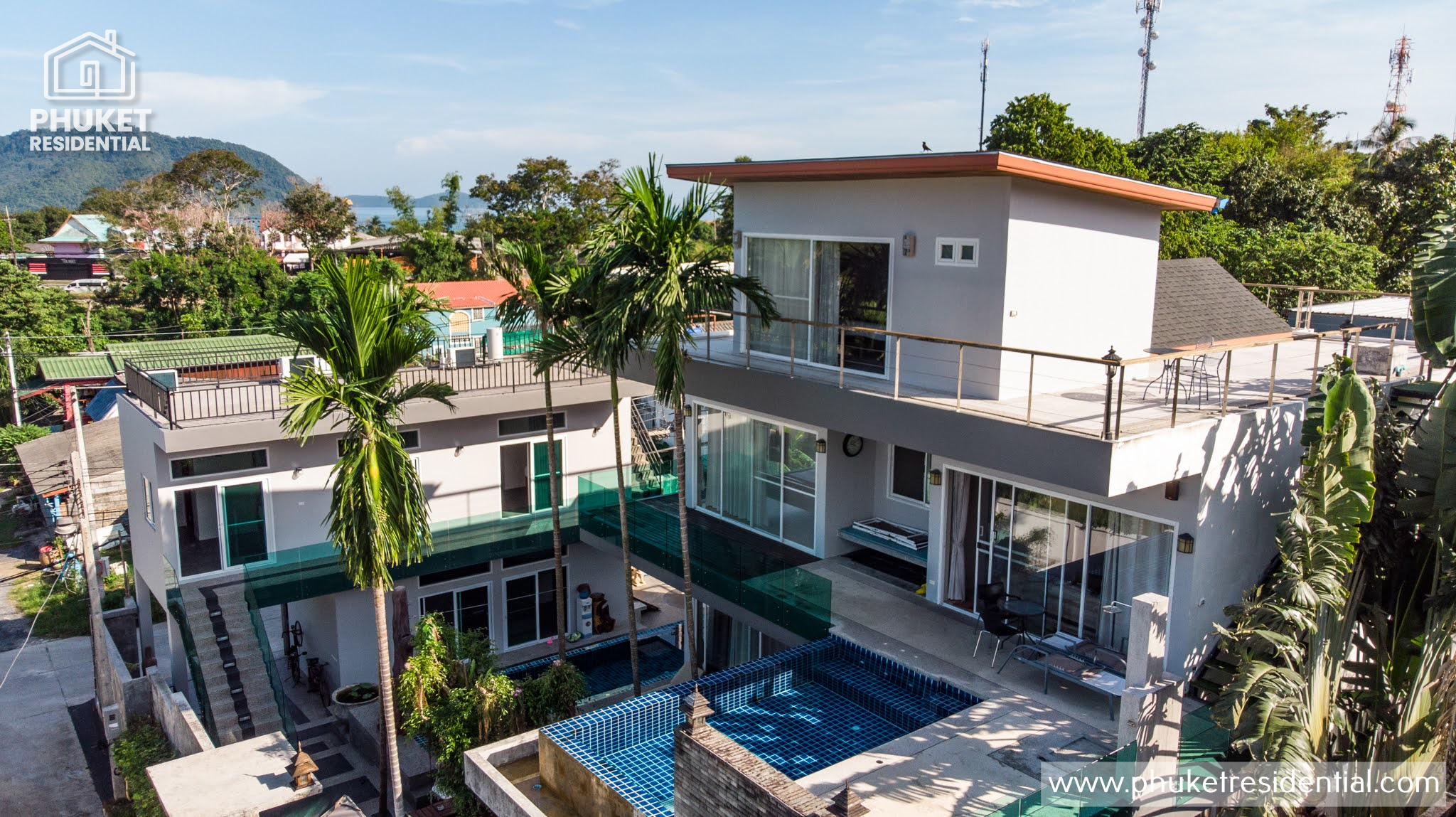 This unique villa is actually two separate buildings with a combination of eight bedrooms, seven bathrooms, two swimming pools, a rooftop terrace and two access carports.