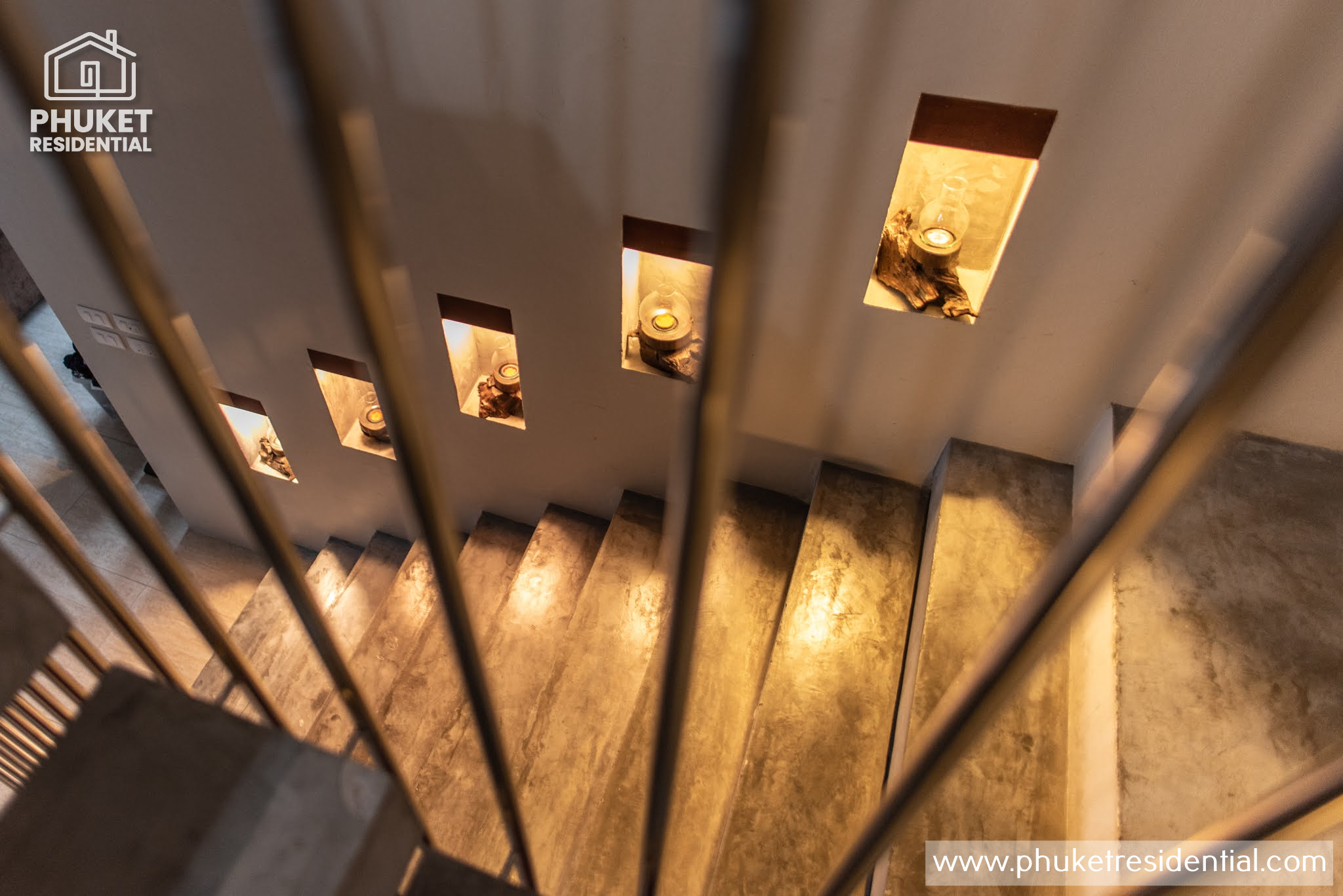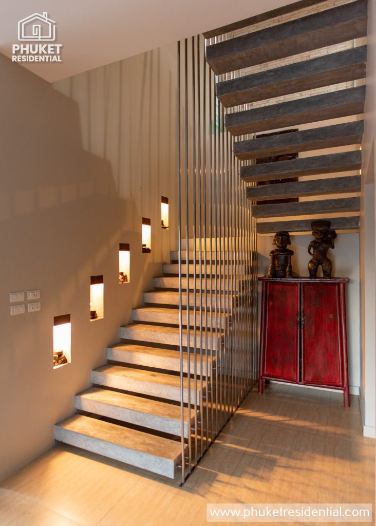 Building #1 is three storeys and a rooftop terrace. On the ground floor is the open plan living room, dining area and western kitchen. This room has loft style high ceilings that lets in lots of natural light. On this floor is one bedroom, one bathroom and a laundry room. There is a floating staircase the leads up to the next two levels.