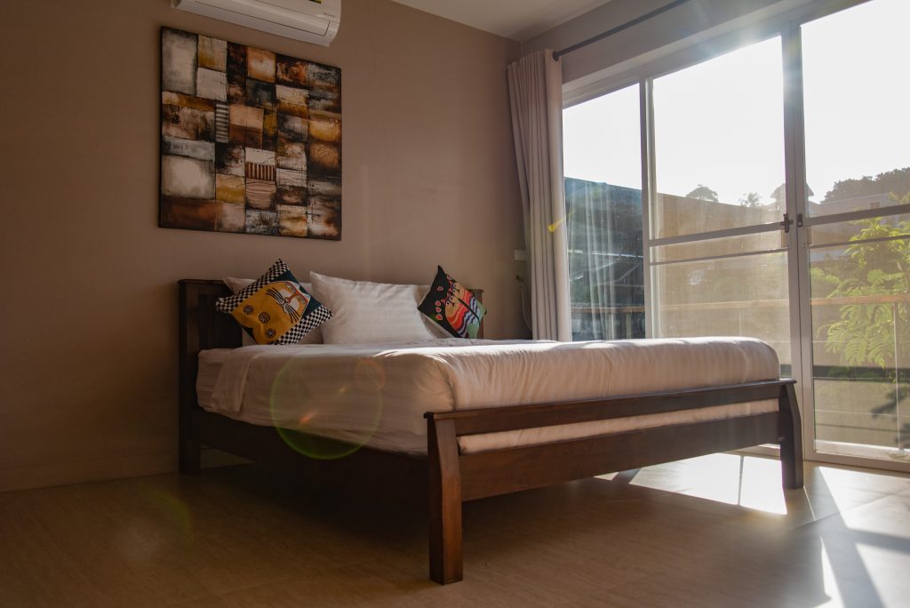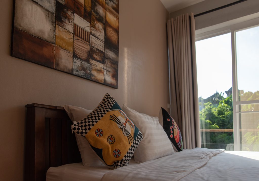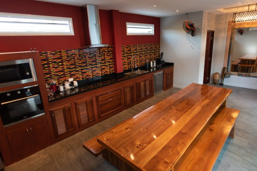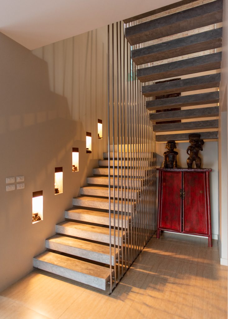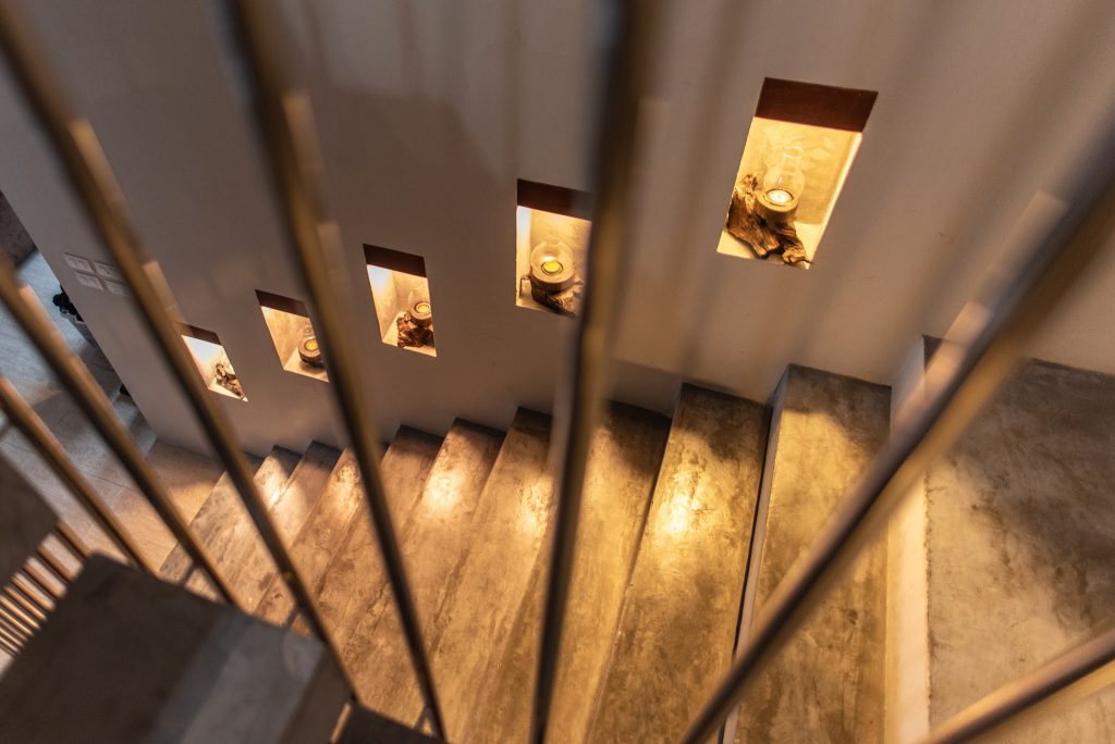Building #1 is three storeys and a rooftop terrace. On the ground floor is the open plan living room, dining area and western kitchen. This room has loft style high ceilings that lets in lots of natural light. On this floor is one bedroom, one bathroom and a laundry room. There is a floating staircase the leads up to the next two levels.