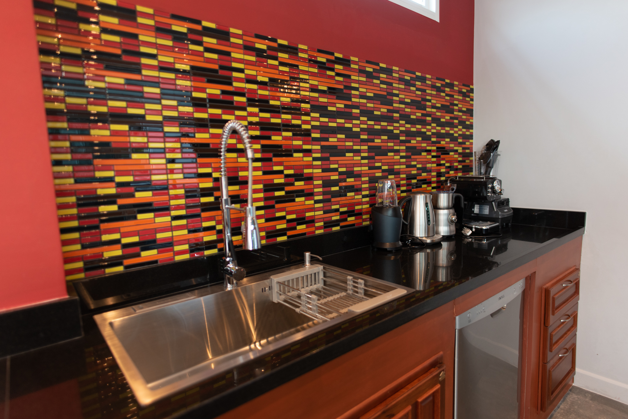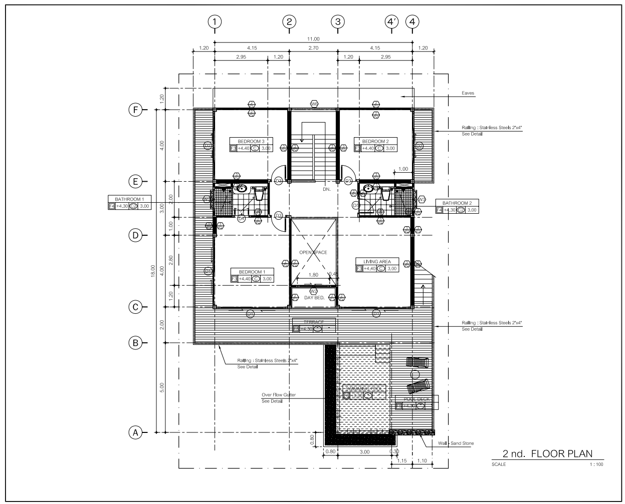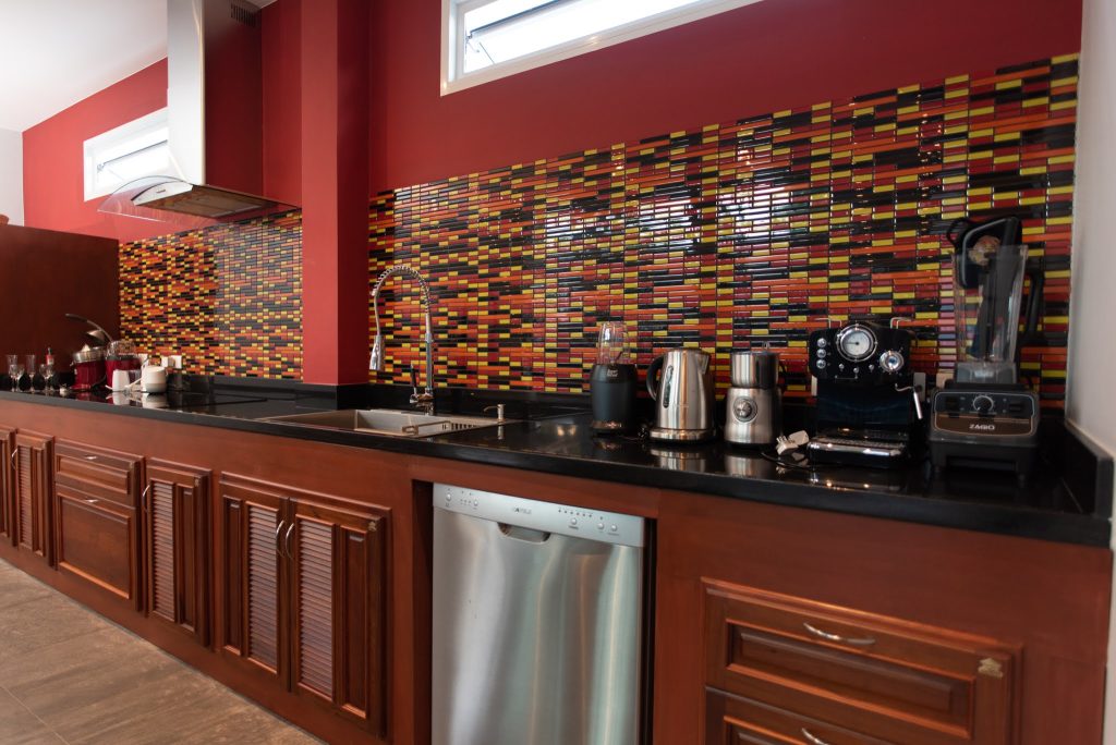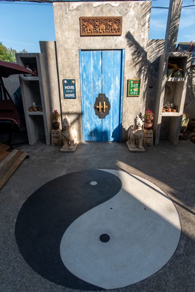 Building #1 is three storeys and a rooftop terrace. On the ground floor is the open plan living room, dining area and western kitchen. This room has loft style high ceilings that lets in lots of natural light. On this floor is one bedroom, one bathroom and a laundry room. There is a floating staircase the leads up to the next two levels.