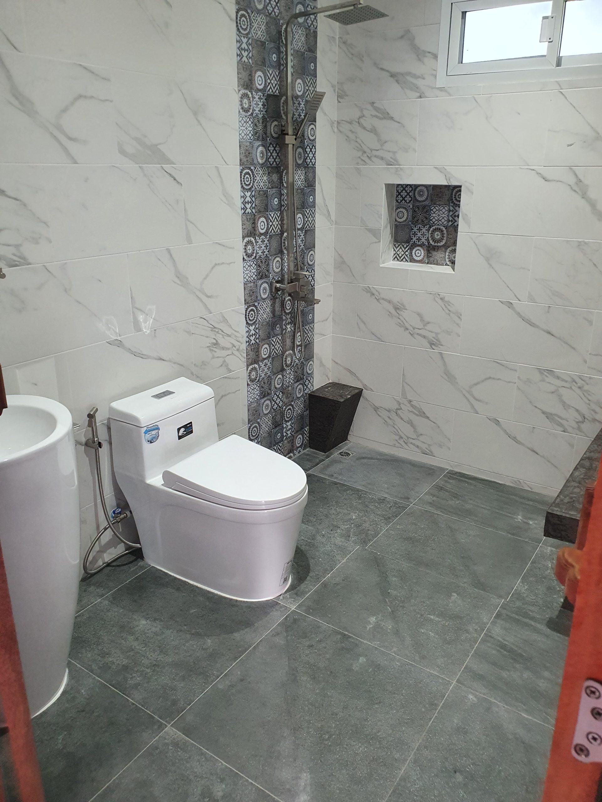 – Bathrooms have foot-steps in the shower area along with inset shampoo holders
